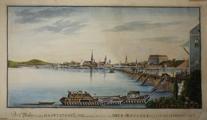 Überaus seltene, großformatige Ansicht (kein Exemplar in einer öffentl. Sammlung nachweisbar).- Blick von Urfahr über die Donau mit hölzerner Brücke.- Der Maler und Zeichner Joseph Löw (*14. April 1770 in Linz; 26. Oktober 1842 in Steyr) war von 1809-25 Zeichenlehrer an der Normalschule in Linz u. ab 1830 "Mal- und Zeichenmeister in der k. k. Kreishauptschule" in Steyr. Er war Mitarbeiter an der "Kirchlichen Topographie" und Mandatar im Traunkreis des Vereins zur Bildung eines vaterländischen Museums für Österreich ob der Enns und Salzburg. Er zeichnete Ansichten von wichtigen Ereignissen, von den Städten Linz u. Steyr, von Christkindl, Losenstein, dem Kefermarkter Altar, dem Traunfall usw.- Tls. leicht gebräunt, rechte untere Ecke ergänzt, wenige kl. Randläsuren, kl. Quetschfalte beim Bildtitel. (Oberösterreich) |