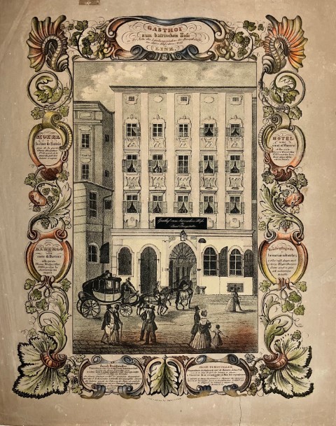 Gasthof zum bairischen Hofe in der Nähe des Landungsplatzes der Donauschiffe, am oberen Wasserthore No. 133 in Linz. Farblithographie v. Jos. Hafner um 1840, 46,5 x 37,5 cm (Blattgr.)Giordani S.241, Nr. 11.- Frühe, großformatige Fremdenverkehrsreklame / Hotelprospekt, sehr selten.- "Ansicht des Gasthofes mit Staffagefiguren auf einfahrender, vierspänniger Kutsche, umgeben von Rankenornament mit Kartuschen, in welchen der Werbetext des Inhabers Jacob Burgstaller in fünf Sprachen eingeschrieben ist" (Giordani).- Der Gasthof wurde im Jahr 1838 als "Bayerischer Hof" eröffnet.- 4 hinterlegte Randeinrisse. (Oberösterreich, Gastronomie, Hotellerie) |