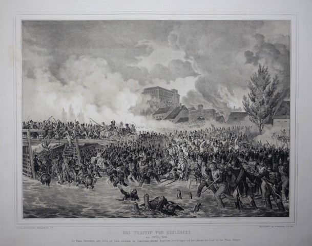 Momente aus Österreichs Kriegsgeschichte Nr. 13.- Sehr großformatige Darstellung.- Beim Übergang über die Traunbrücke bei Ebelsberg am 3. Mai 1809 kam es zum schwersten Gefecht: Zeigt den Moment als die Wiener Freiwilligen die Traunbrüche erstürmen, während Rosenberg-Chebaulegers und Karl-Ulanen den Feind in die Traun drängen.- (Oberösterreich, Schlachtenbild, Napoleonische Kriege) |