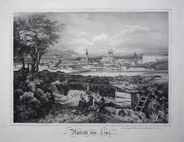 Ungewöhnliche, seltene Ansicht (kein Exemplar in einer öffentl. Sammlung nachweisbar).- Blick vom Pöstlingberg über das urfahraner Ufer auf die Stadt Linz.- Franz Werner (um 1789 - 1854 Wien) war Drucker und Verleger in Wien.- Unten kl. Randeinriss, sehr breitrandig. (Oberösterreich) |