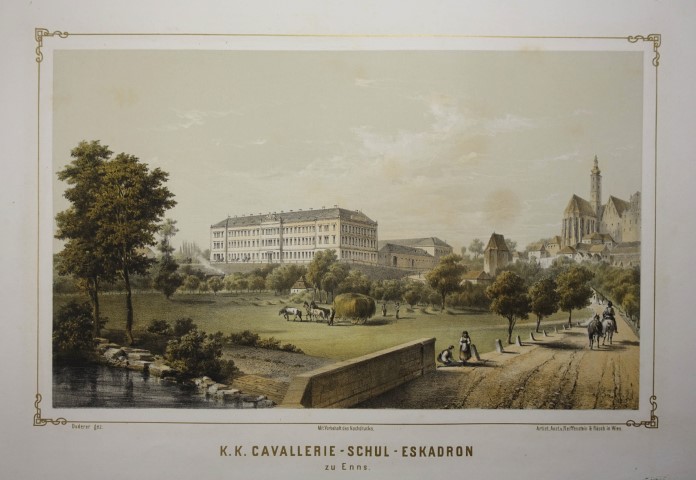 Nebehay-W. 147 / 14.- Seltene, großformatigen Ansicht.- Den Glanzpunkt für Enns als Kavalleriegarnison bildete der zwischen 1854 bis 1857 errichtete Bau der K&K-Kavallerie-Schuleskadron mit der Winterreitschule.- Der Großvater des Schriftstellers Heimito von Doderer, Wilhelm von Doderer (1825-1900), war als Architekt in Wien tätig. Sein wichtigstes Ansichtenwerk ist das über die österreichischen Militärbildungsanstalten.- Rechts unten alter Bibliotheksstempel, sonst schönes, breitrandiges Blatt. (Donau) |