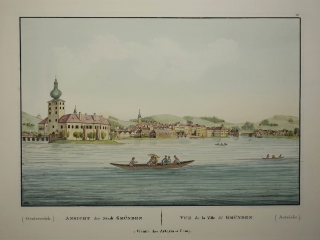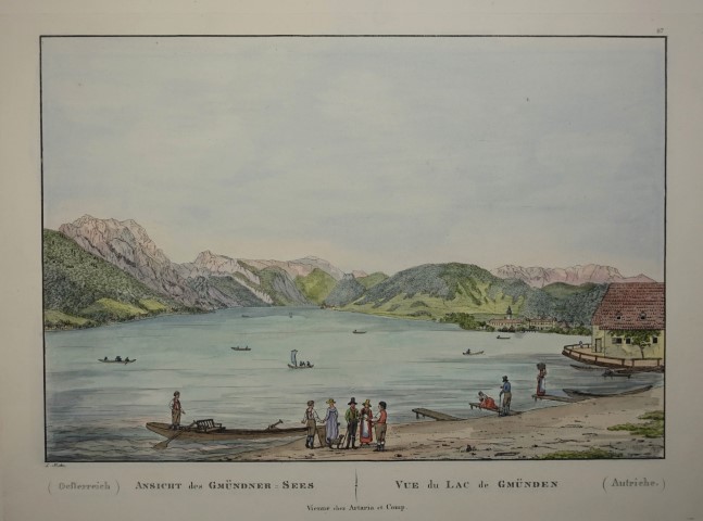 Nebehay-W. 28 / 1.- Mit deutschem u. französischem Bildtitel.- Jakob Alt (* 27. September 1789 in Frankfurt am Main; 30. September 1872 in Wien) begann 1823/24 mit den Arbeiten an den "Vorzüglichsten Ansichten des k. k. Salzkammergutes und dessen Umgebung in Oberösterreich", bei denen ihm zunehmend sein Sohn Rudolf half und die 1833 abgeschlossen wurden.- Links oben leichter Eckknick (Salzkammergut, Traunsee) |