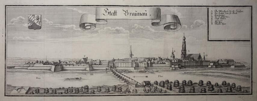 Stadt Braunau. Kupferstich aus F. F. Schrötter "Topographie oder kurze Beschreibung desjenigen Distrikts der bayerischen Lande, welche... Österreich... in Besitz genommen hat.” Wien, Kurzböck 1779, 22,5 x 32,5 cmNebehay-W. 669 / 4.- Das Werk erschien anläßlich der Besitznahme des Innviertels durch Österreich nach dem Teschner Frieden von 1779.- Schönes Exemplar, alte Faltung geglättet. (Innviertel) |